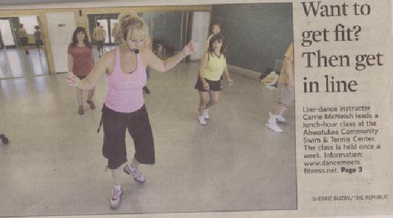 Well, it’s LINE DANCING - which is a “no partner required” dance class. What makes my class different than other Line Dancing classes is the WAY I teach the class. I use my background as a group fitness instructor to keep the class continuous so you burn more calories while learning the dances. It does, however, require some coordination, concentration and perseverance…but doesn’t everything in the beginning? The class is low impact “interval” style as far as the cardiovascular workout. People often ask me “Do you really get a workout with Line Dancing?”. I estimate that you burn approximately 7 calories/minute (420 calories per hour) on average for the class. For the Beginning Classes we move slower and have less complicated chorography. This allows the beginners to learn the different dance steps and rhythms. With the Intermediate Classes I move thru the dances faster and teach more complicated chorography assuming that these dancers have the basic moves down! With either class you are going to be shaking, shimmying and moving that hiney! I also offer a variety of music: country, salsa, pop, oldies, hip/hop, funk, swing, holiday, and rock music!! I always recommend that new members give themselves 4-6 classes just to get used to the dance terms, combinations, teaching style, and having to think while moving! Line dancing is about memorization and repetition. In this class you use your body and your brain. Once you have learned a dance it does not change. That dance is the same every time! I never leave a dance behind. Even as we learn new dances I will still go back and review the ones we have done before -- especially if they are class favorites! The most important part of the class is to come with the right attitude. You may not get the dance perfect the first (second or third) time but you “fake it ‘till you make it”! Have fun and keep moving!